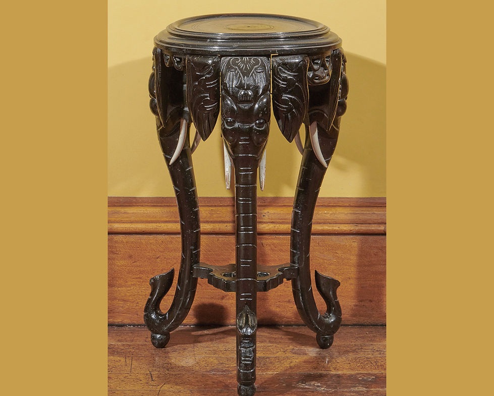 A stained timber plant stand is located to either side of the Library door. The legs are fashioned to resemble elephant trunks and the 'tusks' are of bone. Probably late Victorian (c. 1870-1901) or early 20th century in date.